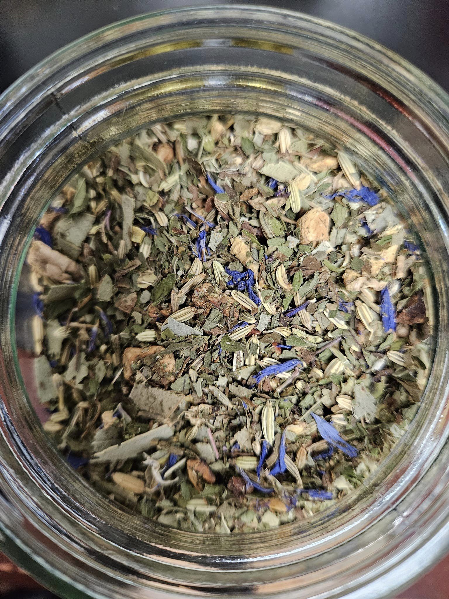 Ingredients: fennel, apple pieces, candied aloe vera (15%) (aloe vera, sugar), eucalyptus leaves (14%), peppermint, ginger pieces, sweet blackberry leaves, manuka honey powder (manuka honey, maltodextrin) (1%), blue cornflower blossoms