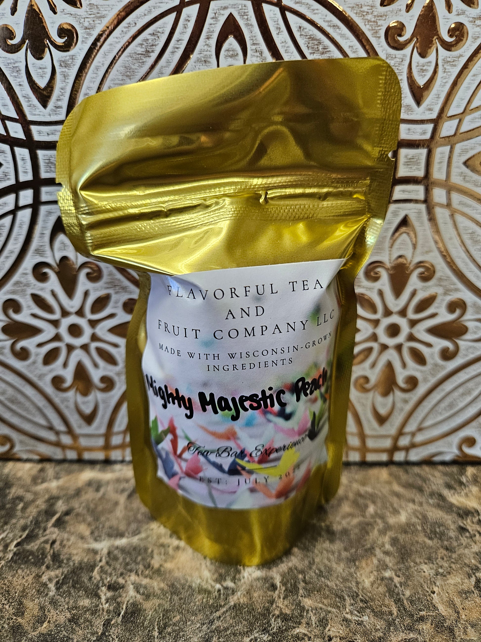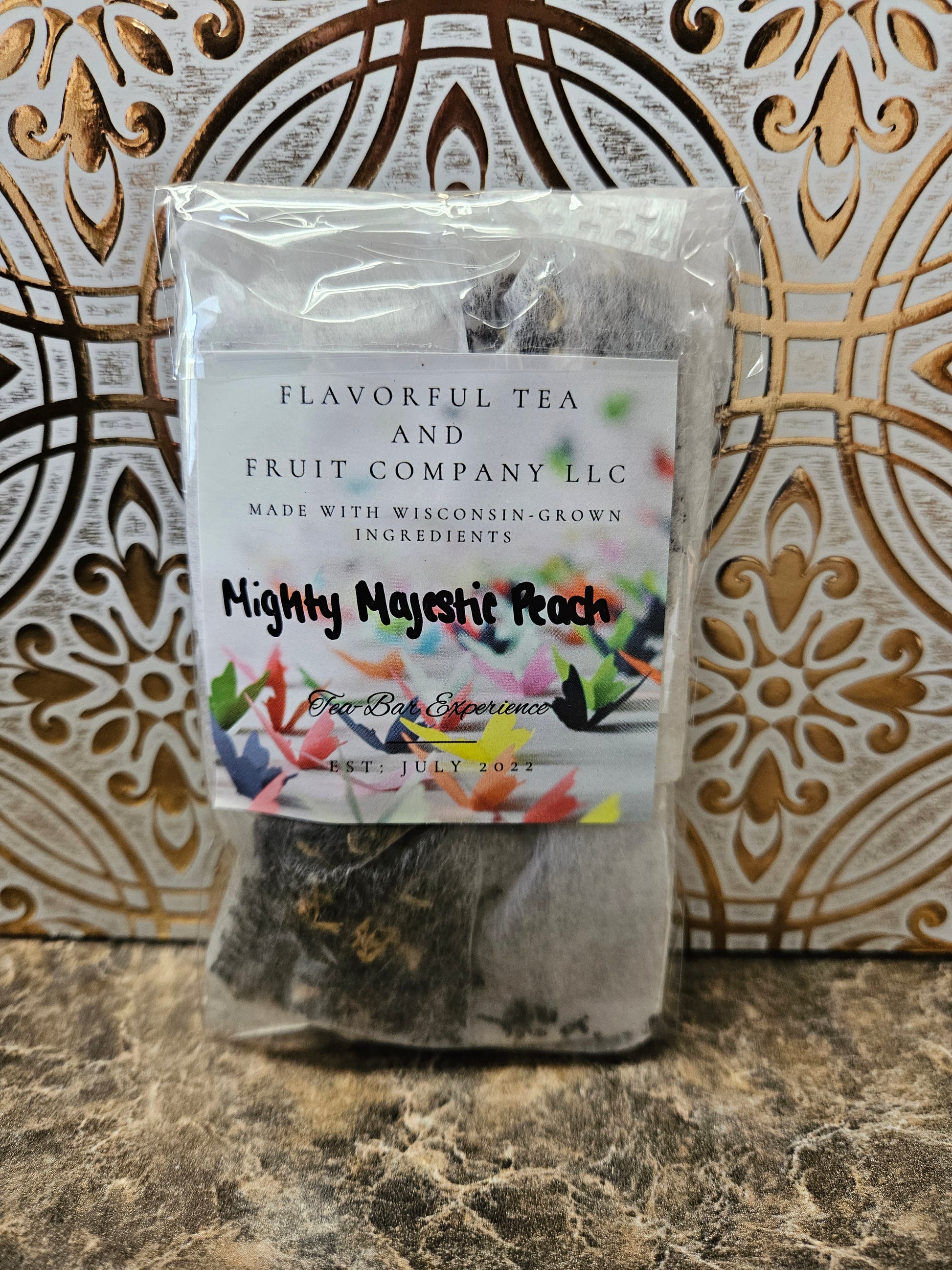 Mighty Majestic Peach Tea brews for 3 minutes at 212 F. Use 1 level teaspoon of dry ingredients for a 6-ounce cup and re-steep the same ingredients up to 3 times without compromising flavor or quality.
